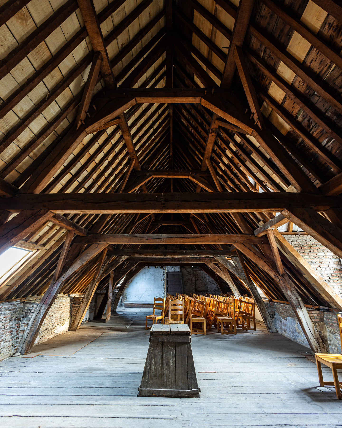 Ook in de neogotische kapel zoeken we naar een evenwicht tussen behoud en gebruik. Daar voegen we nieuwe ramen toe onder de bestaande glas-in-loodramen, zodat de gebruikers van de kantoorruimtes ook buitenzicht krijgen. Daarnaast leggen we overschilderde muurschilderingen gedeeltelijk terug bloot, zodat opnieuw ruimte ontstaat voor de historische gelaagdheid van het interieur.
