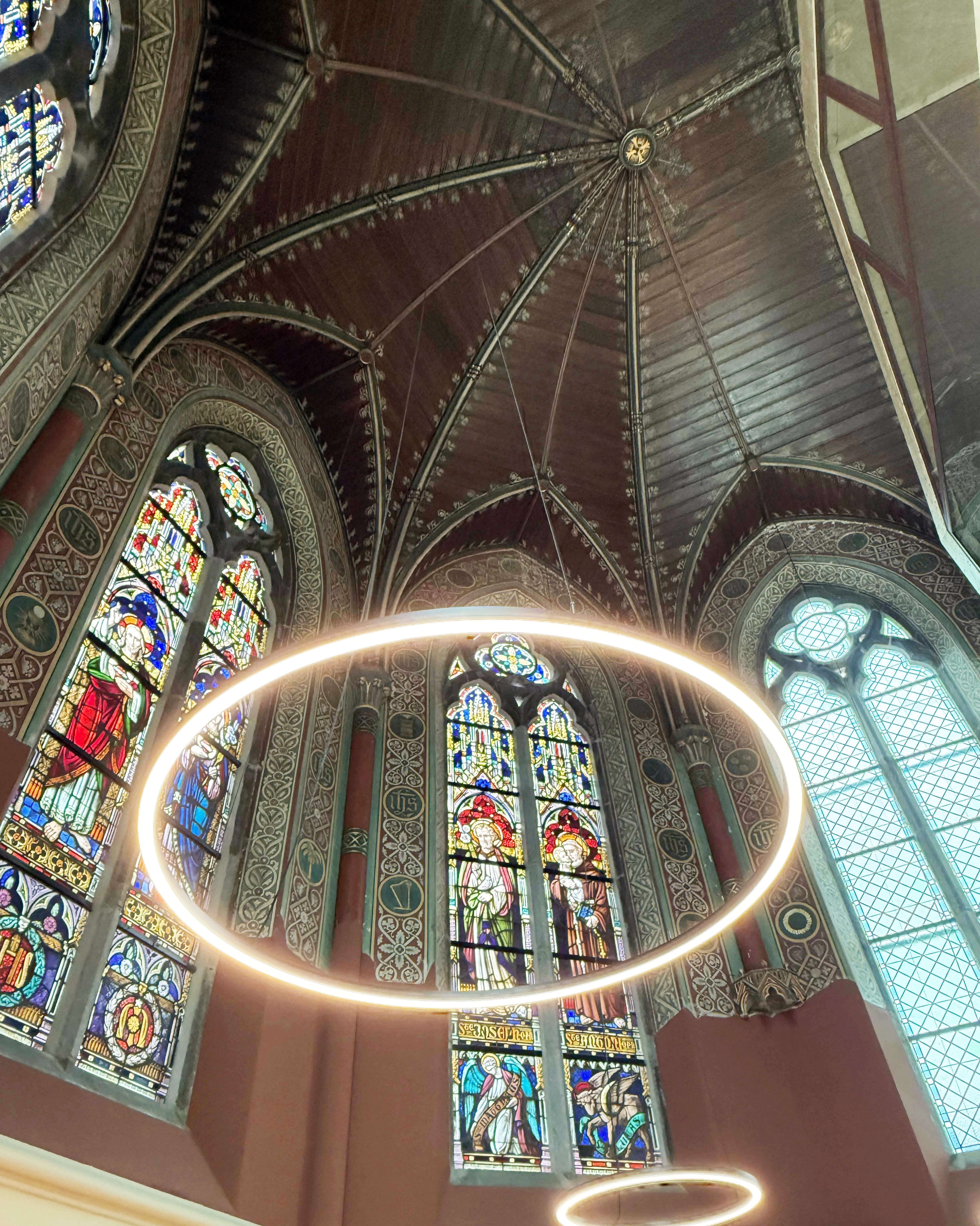 Parallel hieraan werden de gevels, het glas-in-lood, de neogotische muurschilderingen en het houten binnenschrijnwerk met grote zorg gerestaureerd. Ook nieuwe voorzetramen werden geïntegreerd, afgestemd op hedendaagse comforteisen zonder het historische beeld te verstoren.